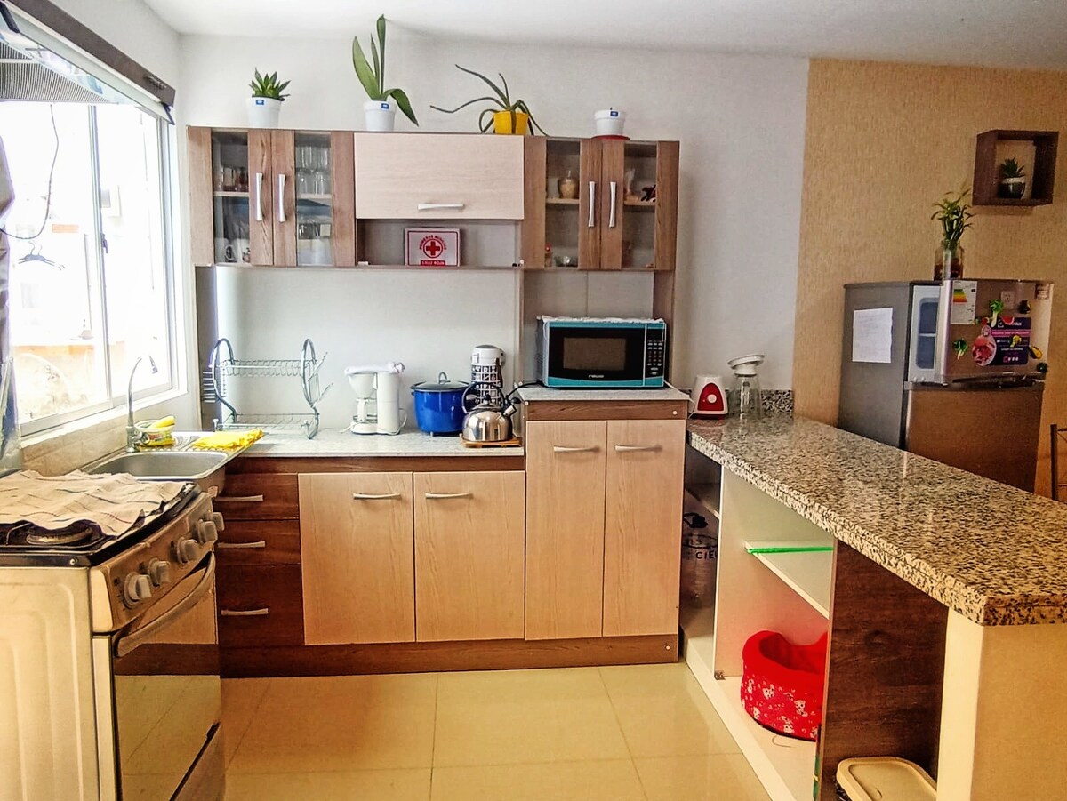 Your family will be surrounded by green areas, wake up to birdsong, spacious apartment with natural light. Beautiful patio on the first floor. 10 minutes from the central square of Ica, 5 minutes from the sanctuary of the Lord of Luren and shopping malls. It is located on the second floor, pet friendly, fully equipped kitchen (microwave oven, sandwich maker, blender, coffee maker, kettle); with washing machine, TV with Chromecast in the shared living room, WIFI, bathrooms with hot and cold water.