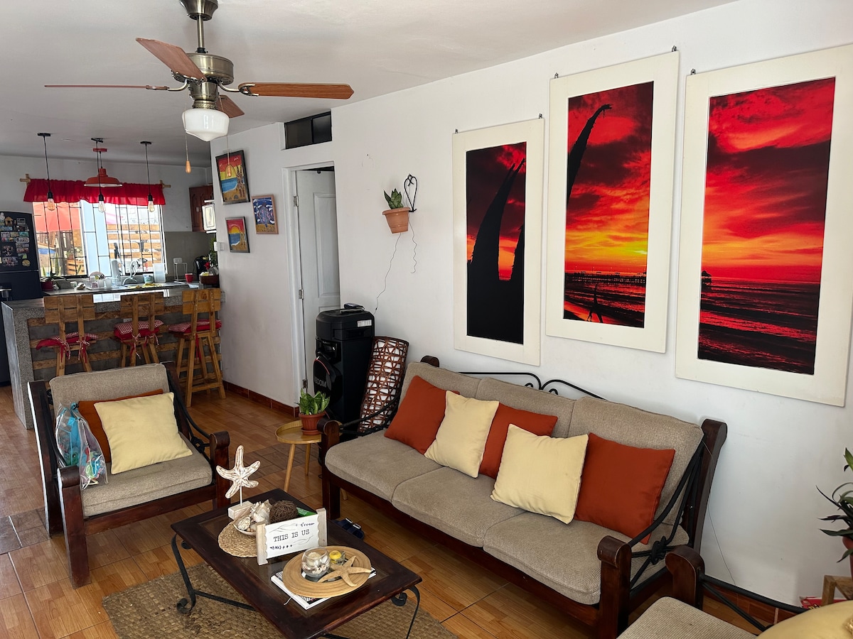 Oasis Azul Huanchaquito is a spacious, oceanfront space, perfect for relaxing and sharing memorable moments. The house is bright, functional and is delivered as shown in the photos. From the second floor you will enjoy a partial ocean view and sunsets that are truly enchanting. The bed capacity is for 5 guests, but the space allows for more people for meetings or events, offering a comfortable, sincere atmosphere designed for hassle-free enjoyment.