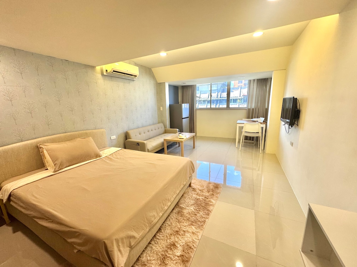 室內的灰白主色,配搭北美木紋銅色傢俱及家飾, 用心為您的居住空間提供沈靜優雅的感覺。日韓系電器的選用,不論是無線充電藍牙喇叭,大螢幕伸縮高清電視,都能滿足您對影音效果的要求。房源位於高樓內縮樓層,阻絕不必要的噪音並滿足您對景觀,安靜及隱私的要求。大樓並配有全天候警衛,住戶專屬電梯,公用大露台,以及地下收費停車場, 位處西門町核心路段,無論搭乘捷運或自駕都非常方便。Earth tone- based interior design offers warming, calm, healing and delighted atmosphere. Room facilities, including double bed, en- suite bathroom with shower enclosure, air conditioning, smart 4K TV with movies/Netflix, WIFI internet, cove lighting and music player with wireless connection & USB charger ports.