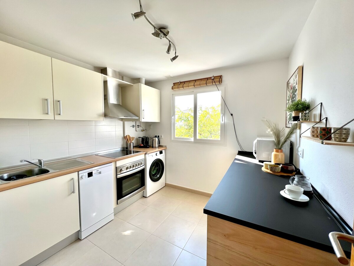 Cozy, bright apartment with a swimming pool, its own parking space, and 250 meters from the beach. Fully equipped, 2 bedrooms with a large terrace, community pool and parking. Very well located, no car is needed to go downtown or to the beaches. Very close to the Mercadona shopping mall. Very quiet residential neighborhood of apartments and close to everything. The airport is 15 km away, about 15 minutes by car. Ideal for couples, business trips, families (with children), and small groups