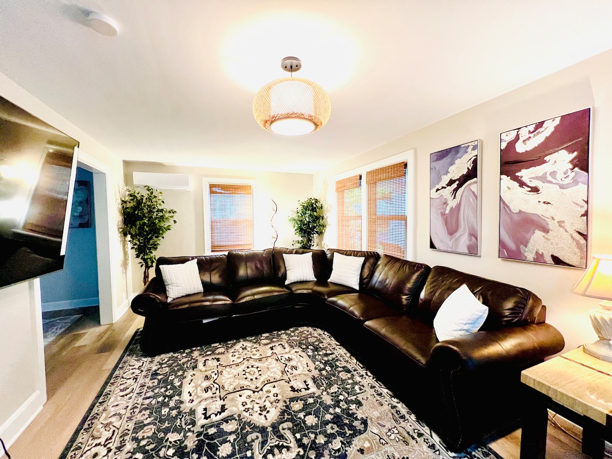 River views and easy access to everything from this perfectly located home base. The spacious unit offers guests a cozy yet expansive space in the heart of the city. The living area features ample seating facing a TV, ideal for relaxation. The kitchen is fully equipped for meal prep, and the bedroom offers a comfortable king size bed and 65" TV. One dedicated parking space is available for added convenience. Experience historic charm with modern amenities for a memorable stay in Harrisburg.
