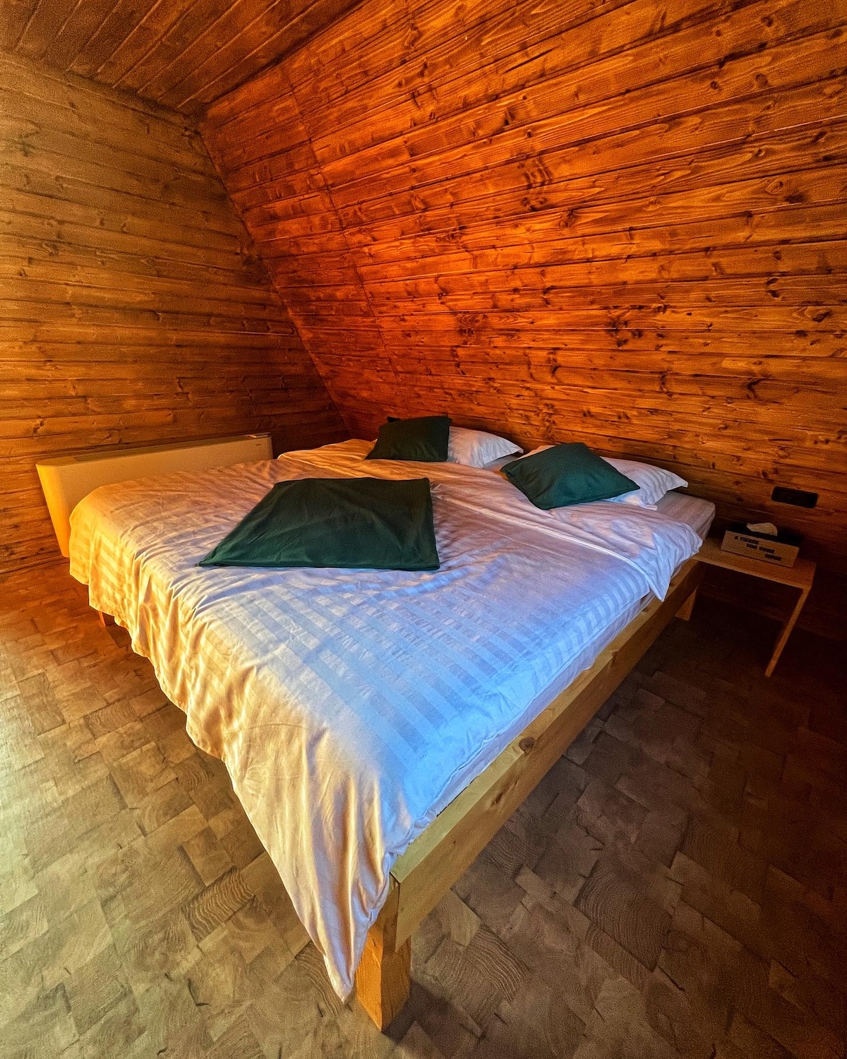 The cottage is located in a quiet area, isolated in nature, 5 minutes away from the place where you can leave your car. In the parking area there is a tennis court, tables with logs, a spacious filigree for serving the table and a space arranged for barbecue. The kitchen and coffee maker, the toilet with shower are also here. In the area of the cottages you have a rustic wooden toilet and a spring.