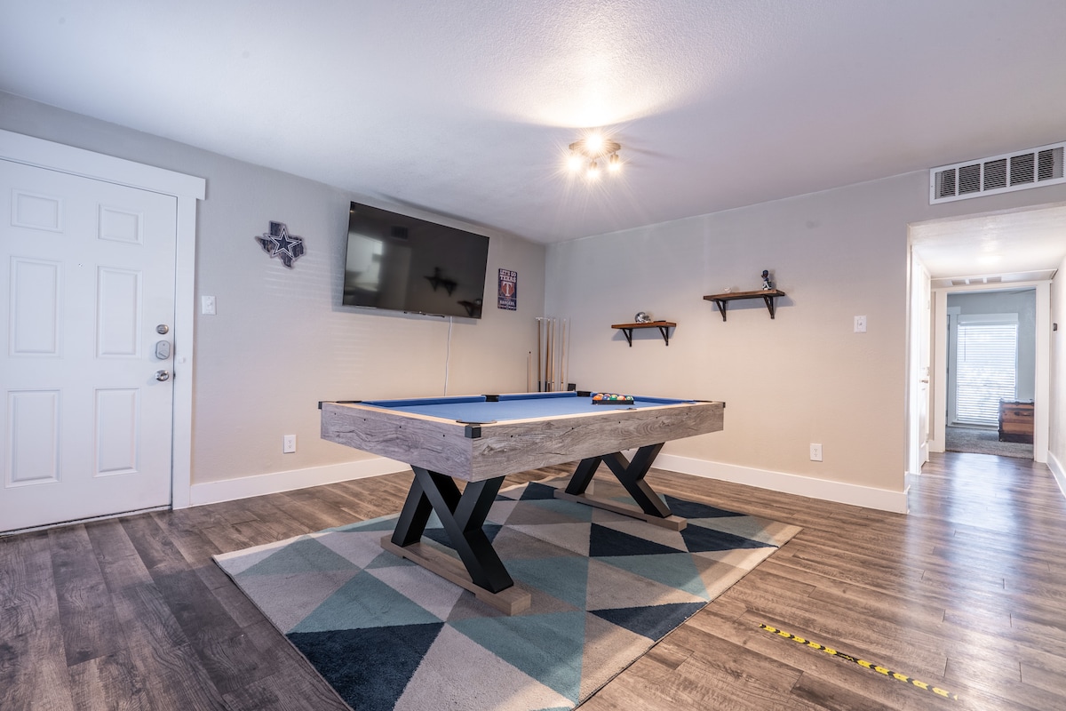 Arlington man-cave meets comfort 6min walk through the park to AT&T stadium, Globe Life Park or Choctaw stadium! Not just a place to stay, but to play! Rack a game of pool or throw some darts while streaming your favorite apps on our 65" 4k HDTV. Relax in style with luxury bedding and towels, each room with own TV, or enjoy a private back yard with tailgating games. Ground floor apartment with a FREE parking spot - no driving or taxi's on game day is a real bonus. 5min drive to six flags & HH!