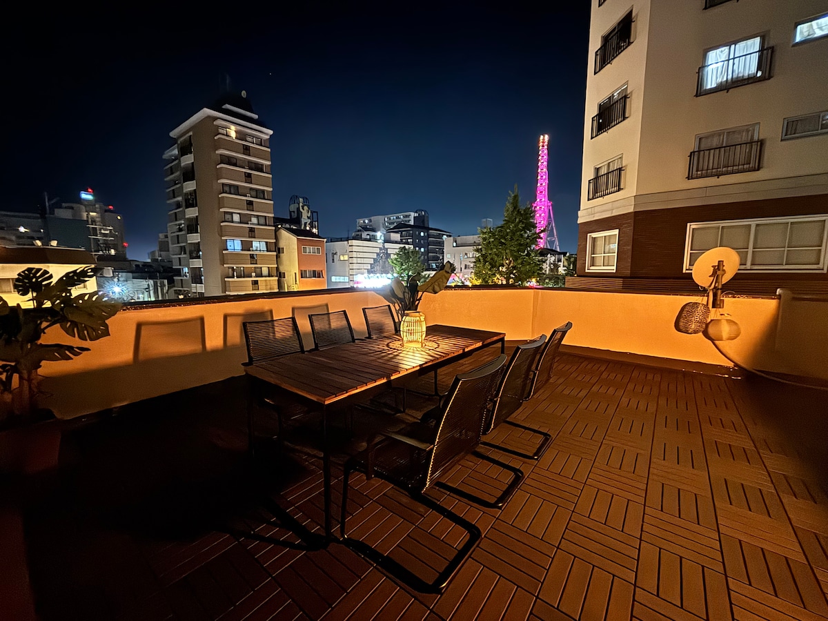 Rooftop BBQ, private deck / 30 seconds walk from the station / 10 minutes to USJ / 5 minutes to Marine World / 60 minutes to the airport direct bus / 1 building rental