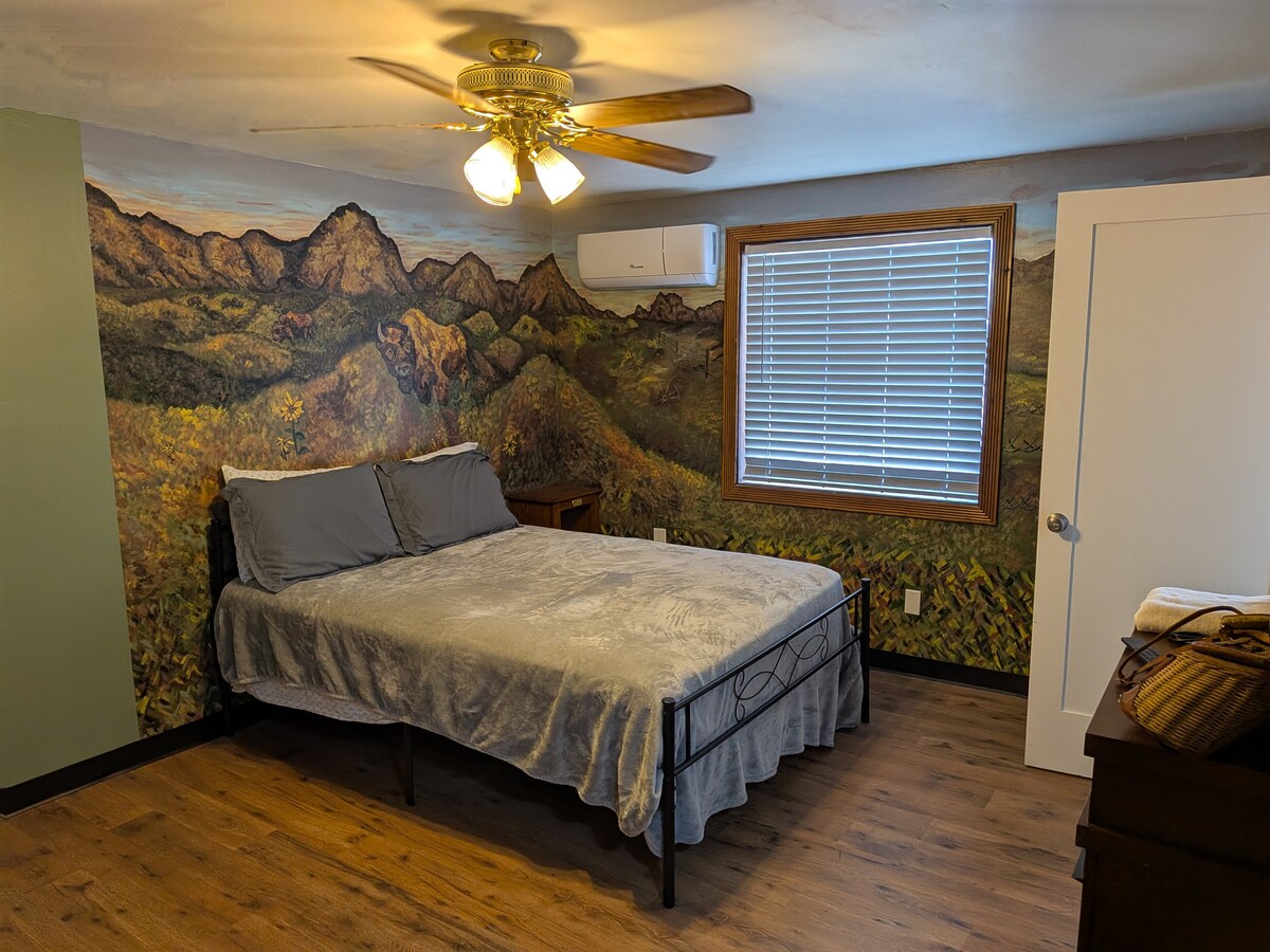 Escape to this cozy rustic staycation featuring a queen bed, fireplace, smart TV, and a stunning hand-painted mountain mural. The kitchenette includes a mini fridge, microwave, cooktop, and dining area for light meals. Freshen up in the private bathroom with a walk-in shower and unique barrel sink. Thoughtful details and warm decor create a charming, comfortable stay. Ideal for couples, solo travelers, or a peaceful stop on your adventure through beautiful eastern Idaho.