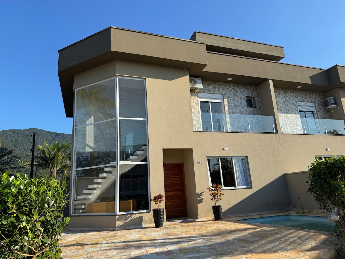 Simple house on Boracéia Beach, in the Morada da Praia Condominium, fully equipped house, with a swimming pool and a privileged view of the mountains. The rooms have air-ing and Wi-Fi with great speed and connectivity. Fenced house where your Pet remains protected. Come and enjoy this sanctuary, where Nature merges with the beach of calm waters and white sand.