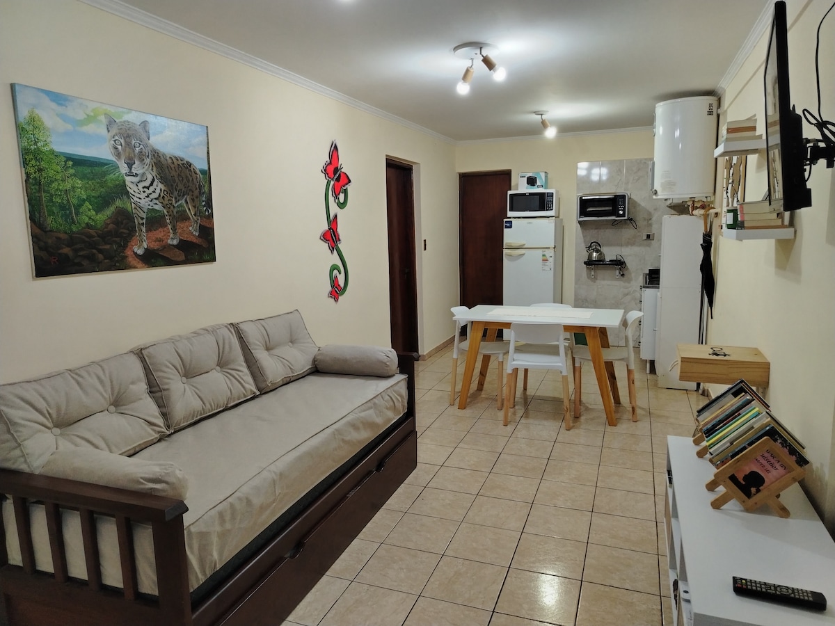 The apartment is on the third floor (by stairs) of a safe complex, located 100 meters from Av. Victoria Aguirre, where you can take the bus to the Iguazu Falls, and access supermarkets, pharmacy and restaurants. Fully furnished, it has Wi-Fi, TV with platforms, washing machine and air conditioning in the living room and bedroom, among others. Enjoy the simplicity of this quiet and central accommodation.