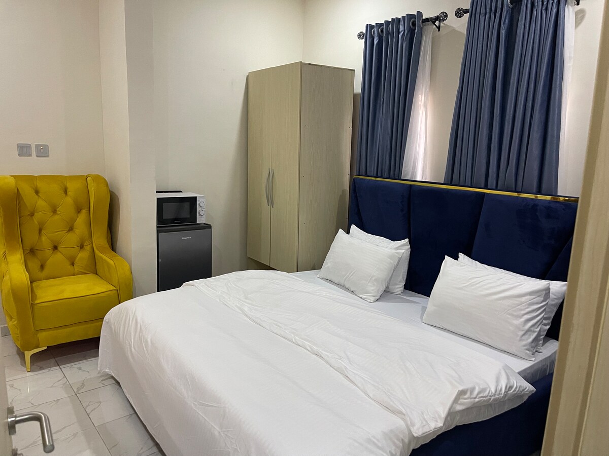 Stay in the center of the action in this one-of-a-kind place. Comes with : 24hrs power & Security Cleaning DSTV "43"inch Smart TV Working space Mini Refrigerator Microwave Unlimited internet Note: The apartment comes with a refundable Caution Deposit of 30,000 which is refundable latest 24hrs after check out once everything is confirmed okay and no damages