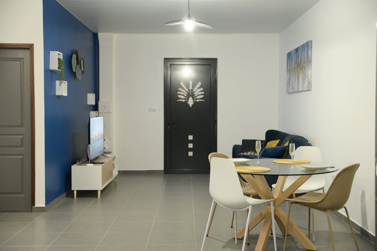 Cozy apartment, new, air-conditioned and relax in a king size bed with TV and a large sofa bed with 65" TV. Close to the village, airport, big shopping mall 20 min away. The 15 m2 terrace for smokers with a jacuzzi for 2 to 4 people and 2 parking spaces. Overnight stay for 4 people/min. 1 night. Weekly or monthly, decreasing price. Check-in between 1 p.m. and 9 p.m./check-out between 6 a.m. and 11 a.m. The entrance and exit are autonomous with a key box. We are classified 3 stars.