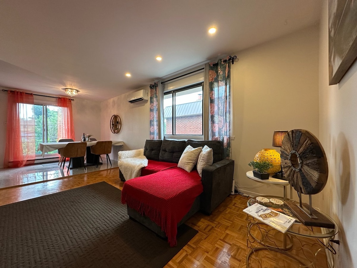 Welcome to your private retreat! Enjoy a cozy 2-bedroom home with free parking on-site, lightning-fast Wi-Fi, A/C and backyard. The Space Bright living area, fully equipped kitchen, washer & dryer, smart TV and dedicated workspace. Location Walk to cafés, groceries and the public transport for quick rides downtown or to Old Montréal. Guest Access Entire property is yours—self-check-in for total privacy. Backyard seating Secure parking 24/7 support Privacy comfort and location in one place.
