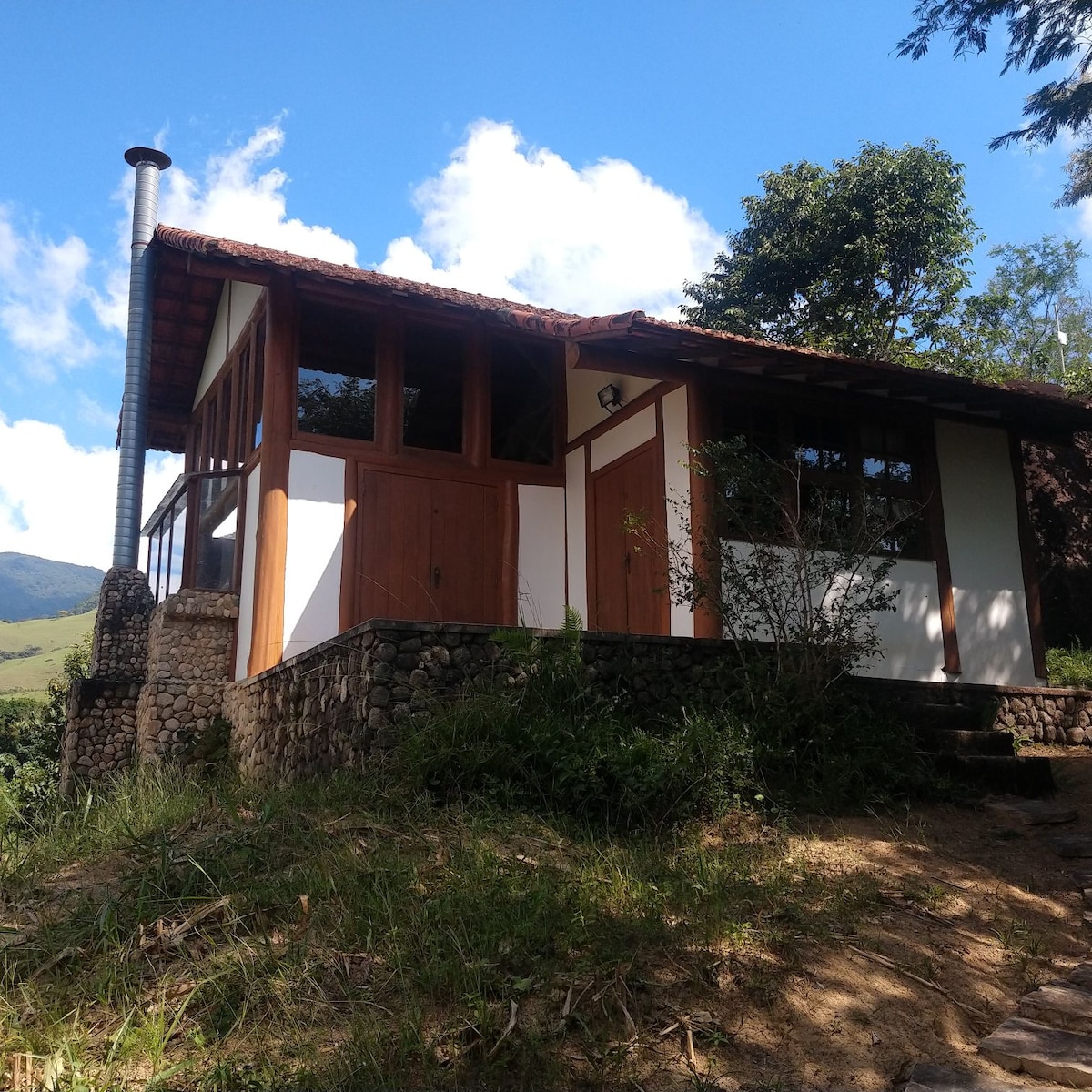 Chalé no alto da morro (já que no Brasil não têm montanha), estrutura de madeira, com mezanino, frente de vidros com visual incrível, lareira para aquecer o friozinho, muita natureza, é perfeito para contemplação da lua e estrelas! Tem 2 quartos com camas de casal e mais 2 colchões de solteiro, todos os espaços no Interior são abertos. É isolado, minha casa fica na propriedade, mas distante uns 80 metros, quem aluga não divide o espaço com outros hóspedes.