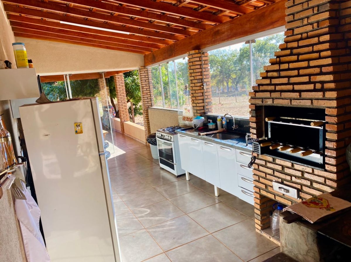 Ranch located 8 km from the city within a condominium, 100 meters from the freshwater beach. Well maintained, with large pool with waterfall and LEDs. All rooms with air conditioning. Beer maker, refrigerator, industrial stove and microwave. Great place to enjoy leisure time.