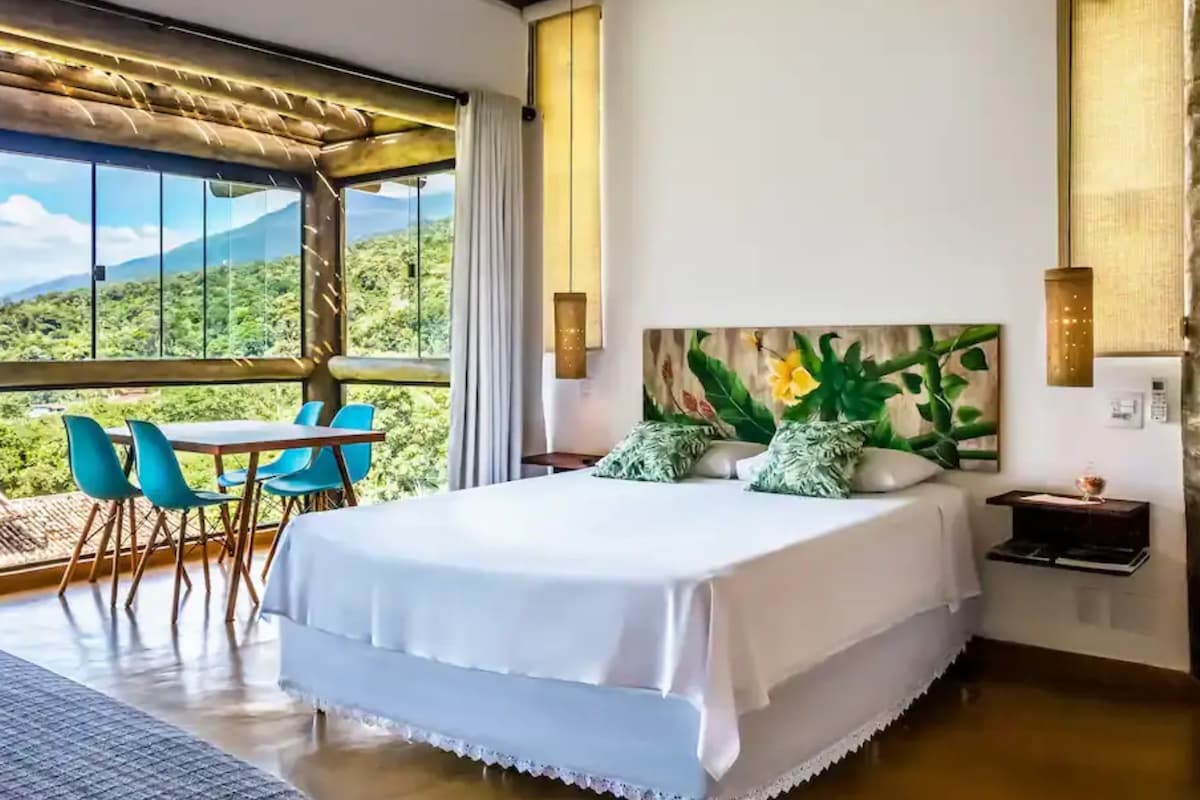 Private Eustáquio Suite at Villa Andylu. Charming, broad and cozy, ideal for couples, accommodates up to 2 people in a comfortable double bed. The exclusive view of the lake and small waterfall, air conditioning and closet. Exclusive private bath with toiletries. Breakfast included. Easy access: 10 min from the ferry, 8 min walking from Feiticeira Beach and 12 min from Julião Beach. For those who come without a car, bus stop on the corner. Free street parking, exclusive to guests