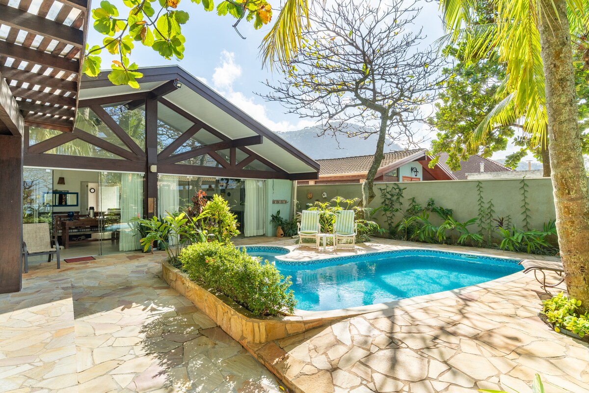 Welcome to your paradise retreat in Ilhabela! Balinese style house with 6 spacious air-conditioned suites conditioning and ceiling fan, just 50m from the sea! Outdoor area with private pool, barbecue and tropical garden. Fully equipped kitchen, for your convenience, we offer extra maid service to cook, clean, tidy, shop and serve breakfast. The location is perfect, close to everything. Ideal for those seeking comfort, sophistication and an unforgettable stay.