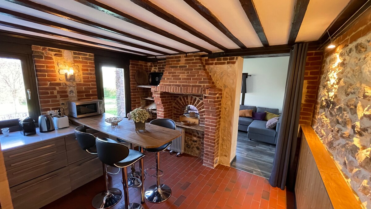 This 1826 Norman house with modern comfort and neat decor offers a relaxing stay for the whole family in peace. On the edge of the forest on a 10,000 m2 garden. Sleeps 6, 2 bedrooms + mezzanine sofa bed for 2 people. High-end bedding. Ground floor: equipped kitchen, functional fireplace living room with turntable and grill for cooking, separate dining room, shower room, toilet. Sheets, towels provided. Dishwasher & washing machine. Board games, barbecue, ping pong. Good Wi-Fi, TV.