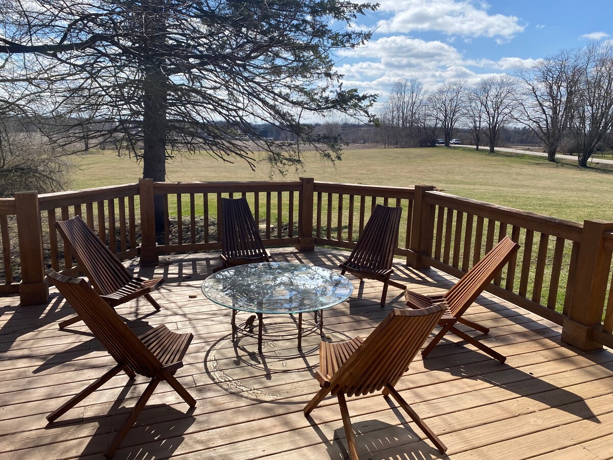 Unwind and find your inspiration just 1.5 hours from Chicago at the Ten Acre Farmhouse Retreat. Designed for families, intimate moments, and retreats. High-speed Wi-Fi, Smart TVs, and workspaces enhance your stay. This 5,000 sq ft estate blends modern comfort with rustic charm on 10 peaceful acres near Lake Geneva. Luxurious bedrooms, a Jacuzzi, and premium entertainment await. Two outdoor cameras monitor the front yard and driveway. No indoor cameras. Book now.