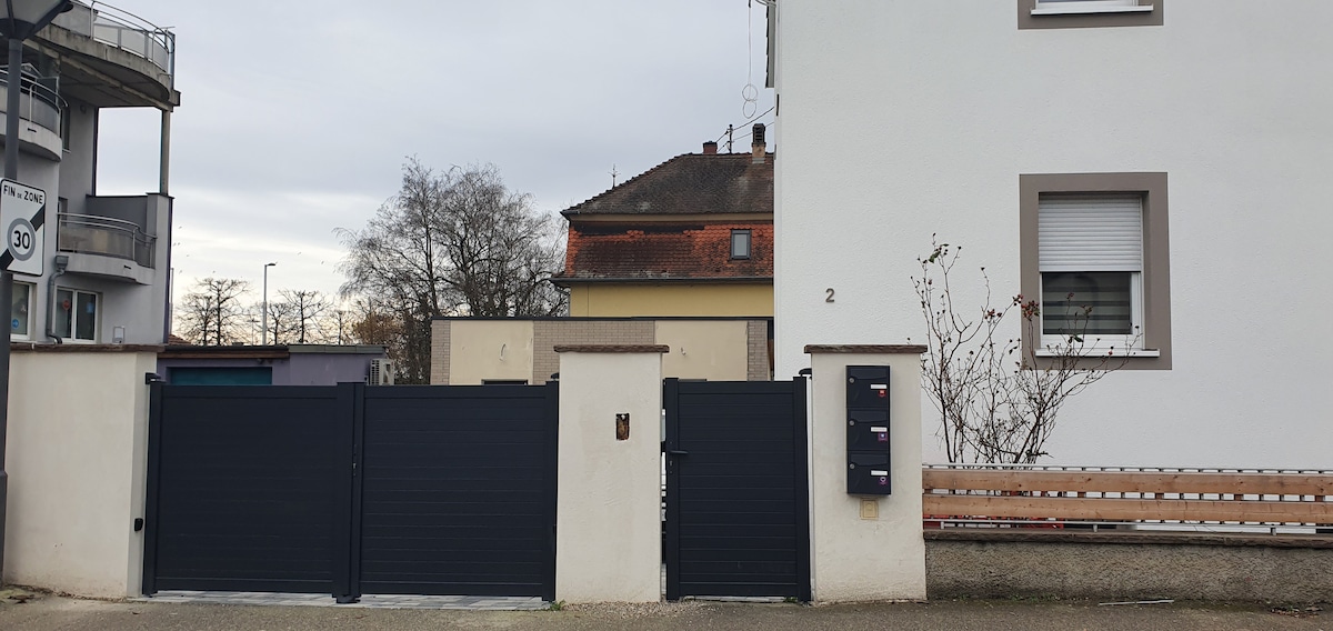 Bright private accommodation in a house located in a charming residential area (independent entrance and possibility of parking). 2-room accommodation with a nice master suite with walk-in shower and a living room with sofa bed, fridge and microwave. Quiet and residential neighborhood It is located a 6-minute walk from the tram line A (Colonne) which leads directly to the city center of Strasbourg and 15 minutes by car. Germany and its Christmas markets are also close.