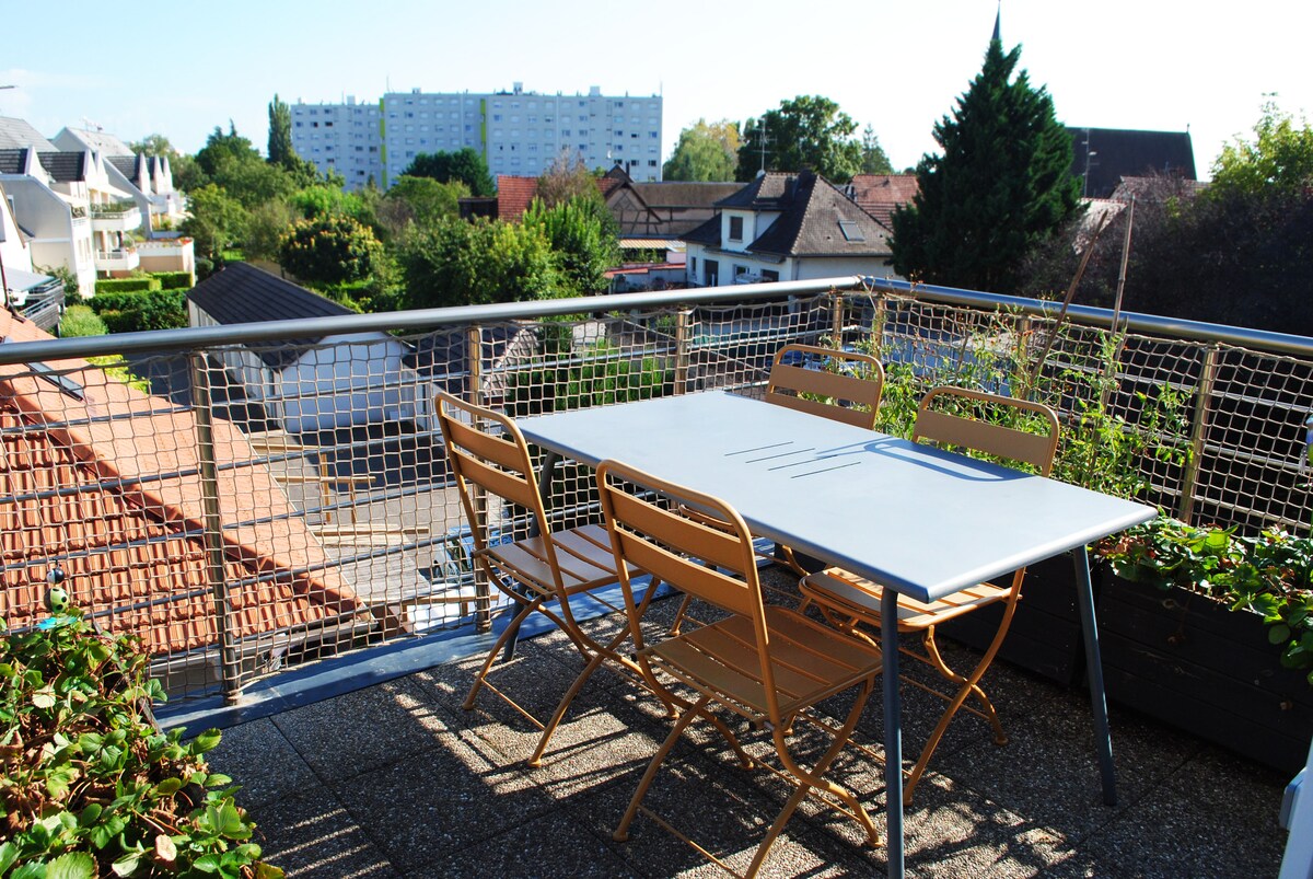 Charming studio with bathroom and private terrace in a quiet neighborhood 15 minutes from the center of Strasbourg. The accommodation has a comfortable 160 x 200 bed, a kitchenette with all dishes and utensils. A high table to eat with coffee machine, milk frother, kettle and cutlery. Coffee and tea are also provided. The bathroom has bathrobes and bath towels... You have access to the terrace, furnished for sunny days or for smokers
