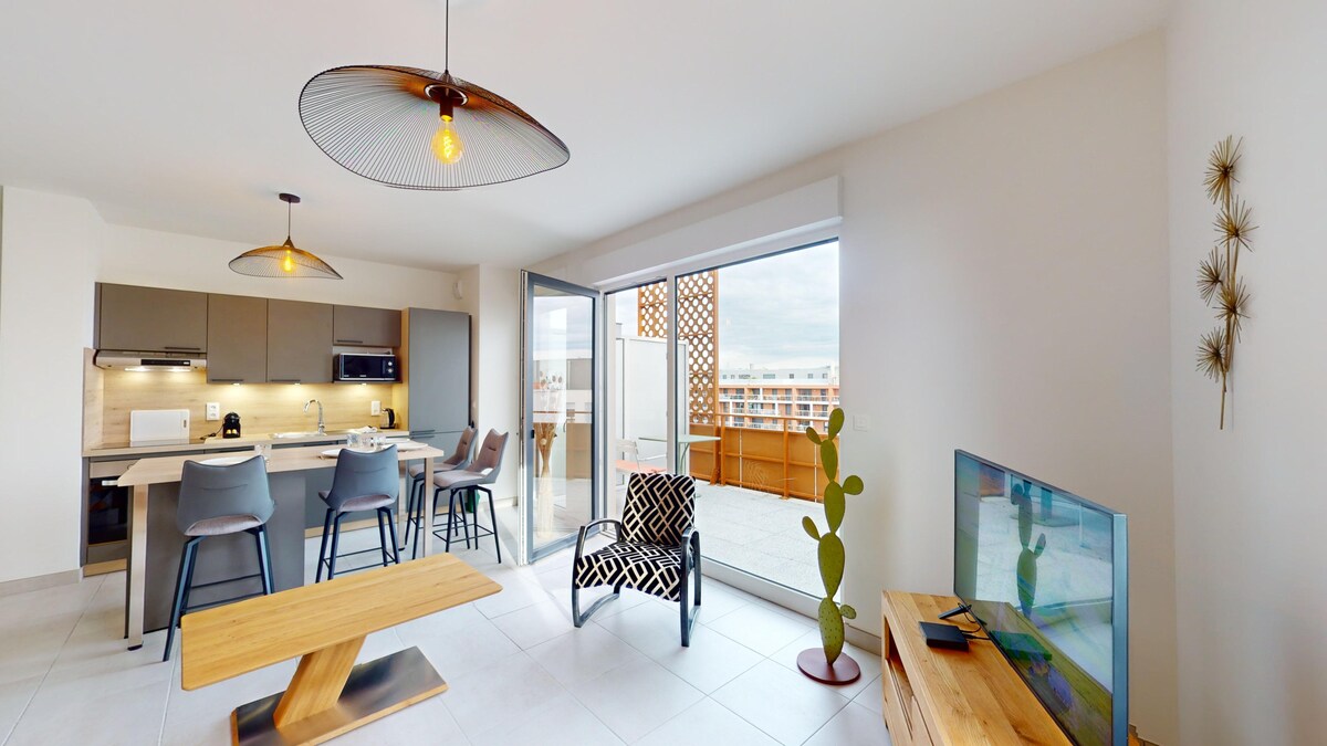 Kick back and relax in this calm, stylish space. We welcome you to this refurbished and optimized 2-room apartment, located in the center of Illkirch, just 100 meters from the tramway connecting directly to the center of Strasbourg. Love yourself in this comfortable cocoon with its quality bedding, high-end bathroom and equipped kitchen that are waiting for you!