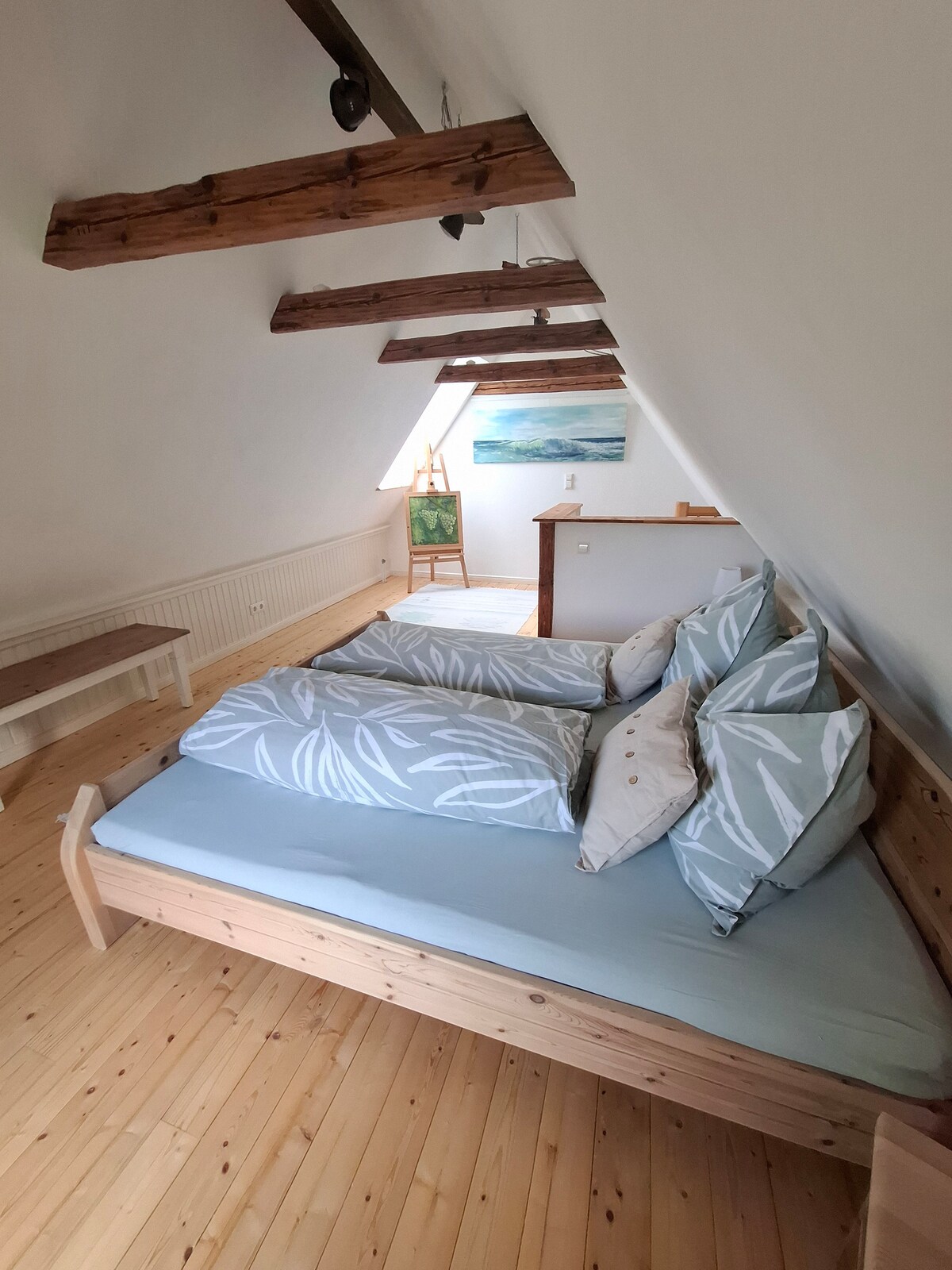 In the listed house right in the center of the Theodor Storm city is the bright, spacious attic apartment "Unter den Sternen" (Under the Stars). Here you will live very close to the North Frisian stars in a living/bedroom with double bed, sofa, armchair, desk & TV, kitchen with dining table. Downstairs you can linger in the courtyard, which invites you to barbecue and linger in gray-colored weather. Sightseeing, restaurants, cafes and shopping in the immediate vicinity will sweeten this vacation base for you.