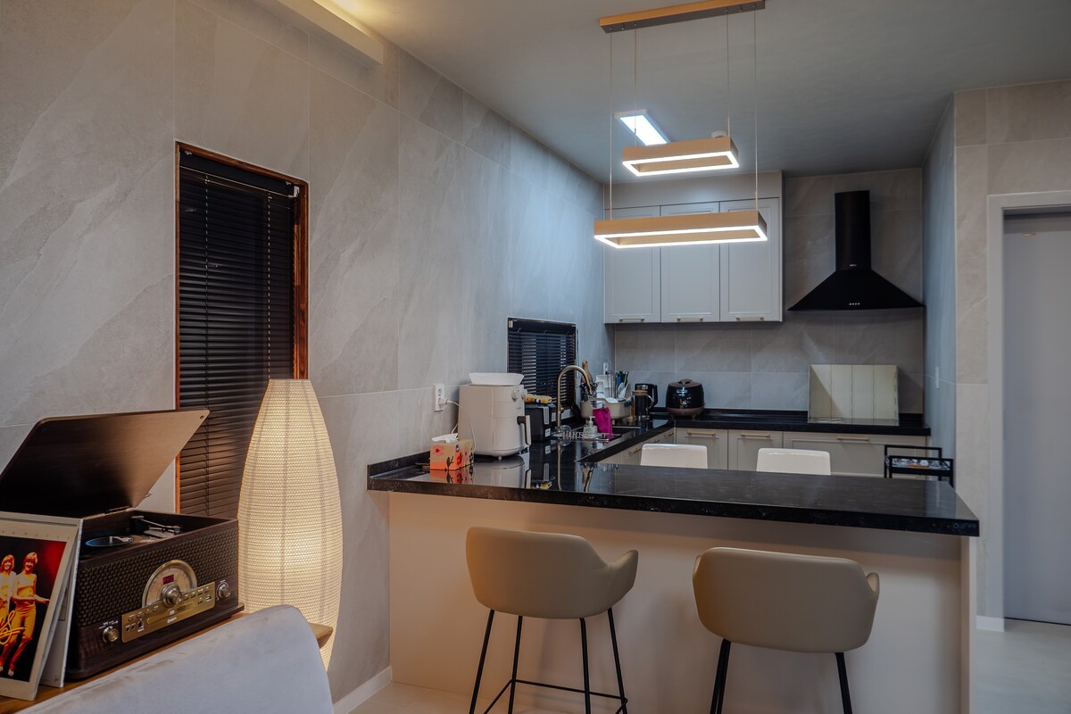 Spend a relaxing day in this evocative space, with views of both the sea and the park, accompanied by LP music and a beam projector. This is an accommodation where you don't have to do anything and can simply relax. The accommodation is located in Sky City, Yeongjongdo, approximately a 5-minute drive to Guup Battery and a 15โ20-minute drive to Incheon Airport, making it ideal for both travel and relaxation. The accommodation has a split-level layout, featuring a living room with a sofa and table, where you can enjoy a relaxing time with a turntable, LP records, a TV and a beam projector. Slow down your day in a cosy atmosphere with soft lighting. On the second floor, there is a bedroom with a queen-size bed, providing a comfortable place to rest. In addition, the sofa bed on the first floor can also be used as an extra bed. In the kitchen, you will find cooking utensils for simple meals and a variety of glasses, so you can enjoy everything from coffee to wine at your leisure. In this space where the sea, music and film come together, Experience a special day that will stay with you for a long time.