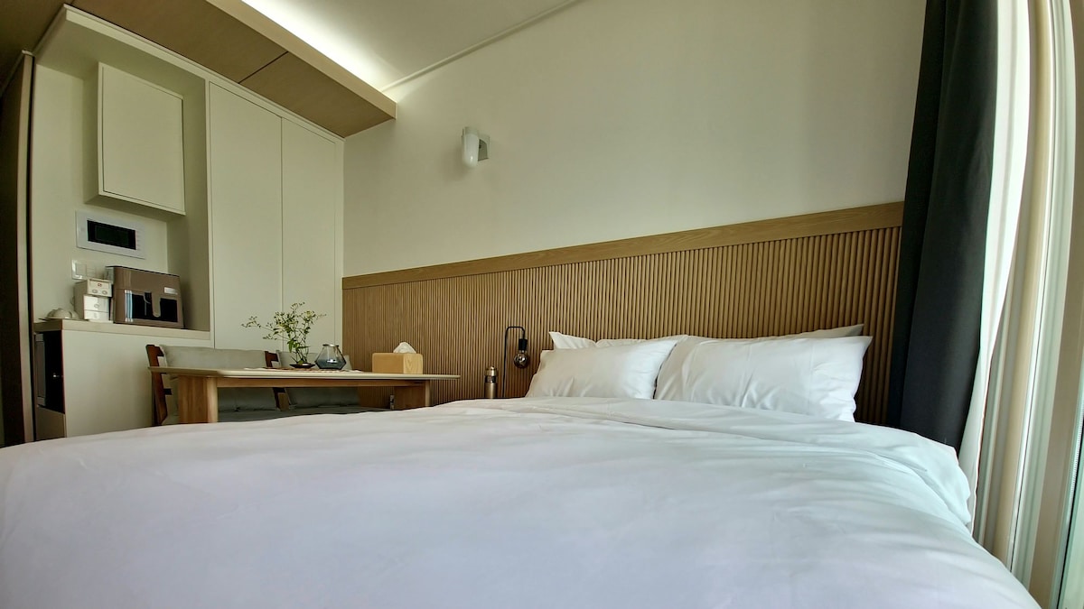 Check-in 4: 00 pm - Check-out 1: 00 pm ♥︎ Bedroom -Allergy care hotel bedding washed daily - 65-inch Android TV, cable channels - Available to watch Disney and Tving - 5.0ch JBL soundbar, movie theater-like sound -Cafe atmosphere with stand lighting and mood ♥︎ Kitchen - Spacious dining table - Self-catering allowed - Wine glasses, soju glasses, openers - Coffee cups, tableware, cooking utensils -Illy coffee machine (2 coffee capsules provided) - Salt, pepper ♥Terrace - Lighting speaker with calm sound -Full ocean view terrace with direct sea view ♥︎ Bathroom - shampoo, conditioner, body wash, etc. ♥ ︎ Underground parking (free) ♥ ︎ Early check-in, late check-out (advance inquiry)