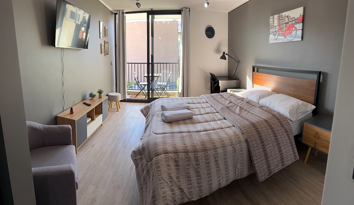 This apartment is ideal for relaxing and enjoying the city. It's centrally located, between the Santiago Centro and Providencia districts, one of the best locations in the city. It offers beautiful views of San Cristóbal Hill and the Sky Costanera. It's just a 3-minute walk from the metro and buses. Includes: Free Wi-Fi, a fully equipped kitchen, sheets and towels included, a large bed with a large Smart TV. Self-service entrance with a key, allowing you to arrive at any time.