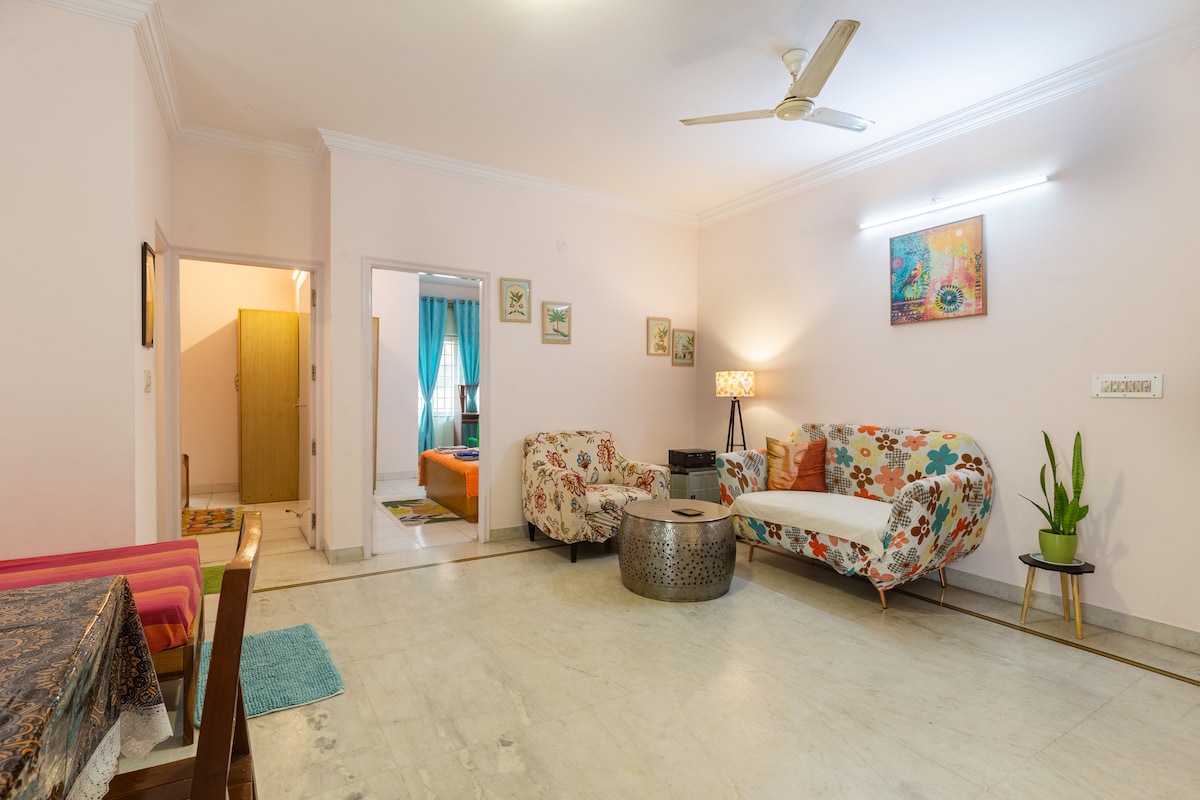 2BHK on ground flr of a 3 flrs building with all necessary amenities & functional kitchen.Owners are experienced hosts and have done up the place with an eye for detail. It is in close proximity to Manyata Tech Park, Palace Grounds, Orion Mall & Hebbal. The well ventilated house welcomes you with positive vibes and has an immediate calming effect. Great for short/long term stays for couples, families, students & professionals. Yum, home cooked meals at extras. Discounts for long term stays only.
