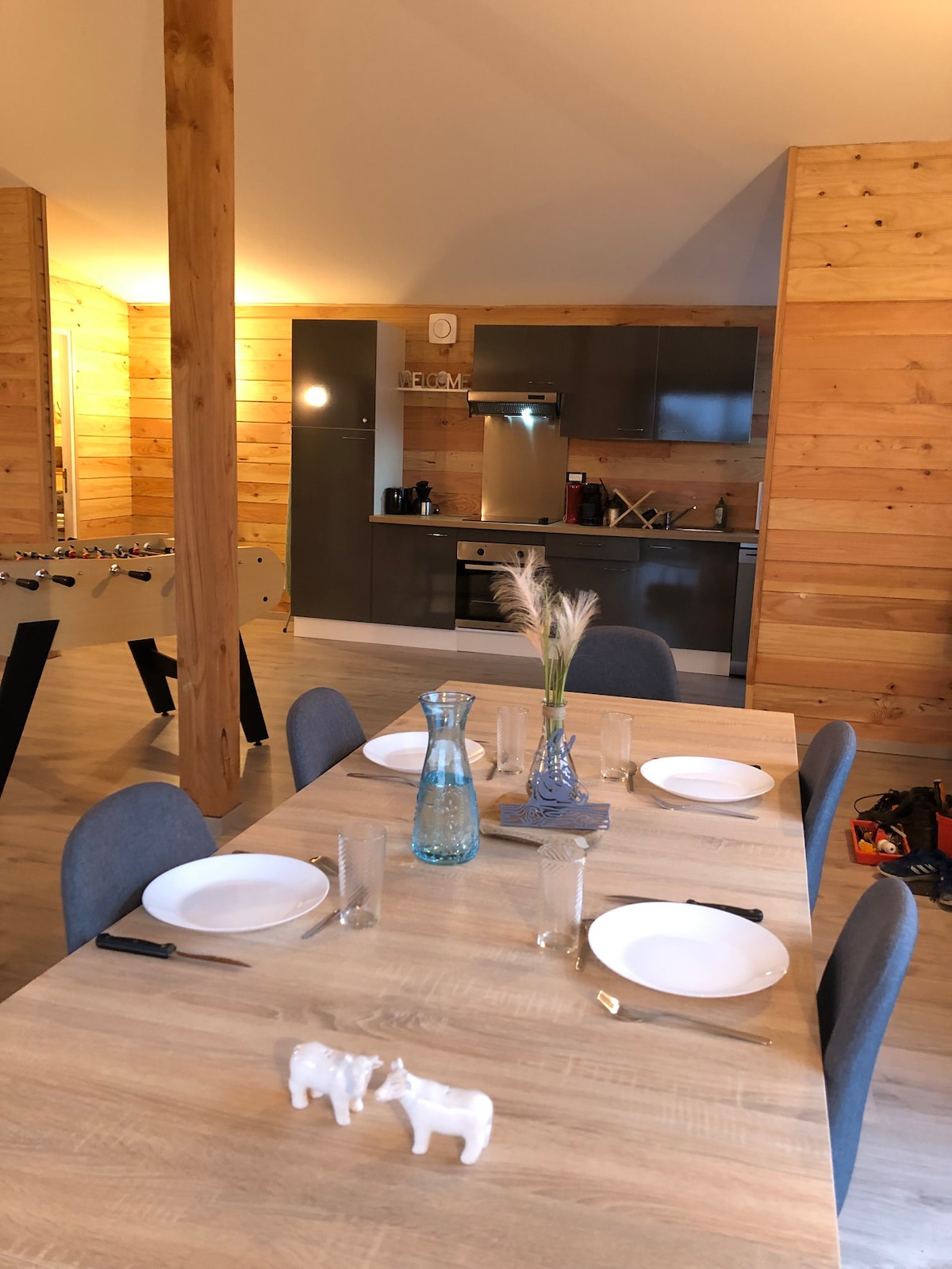 Notre maison en bois climatisée est adaptée aux vacances d'une famille, y compris votre chien. Vous pouvez aussi y organiser votre réunion d'équipe . 2 chambres dont une avec deux lits une personne, une grande salle de 45M2 avec cuisine équipée, lave vaiselle, lave linge séchant et des WC salle de bain. Un baby foot et un terrain en herbe cloturé vous permettront de profiter avec vos enfants, en toute sécurité, y compris de la terrasse en bois. 2 chèvres naines vous accueillerons ;)