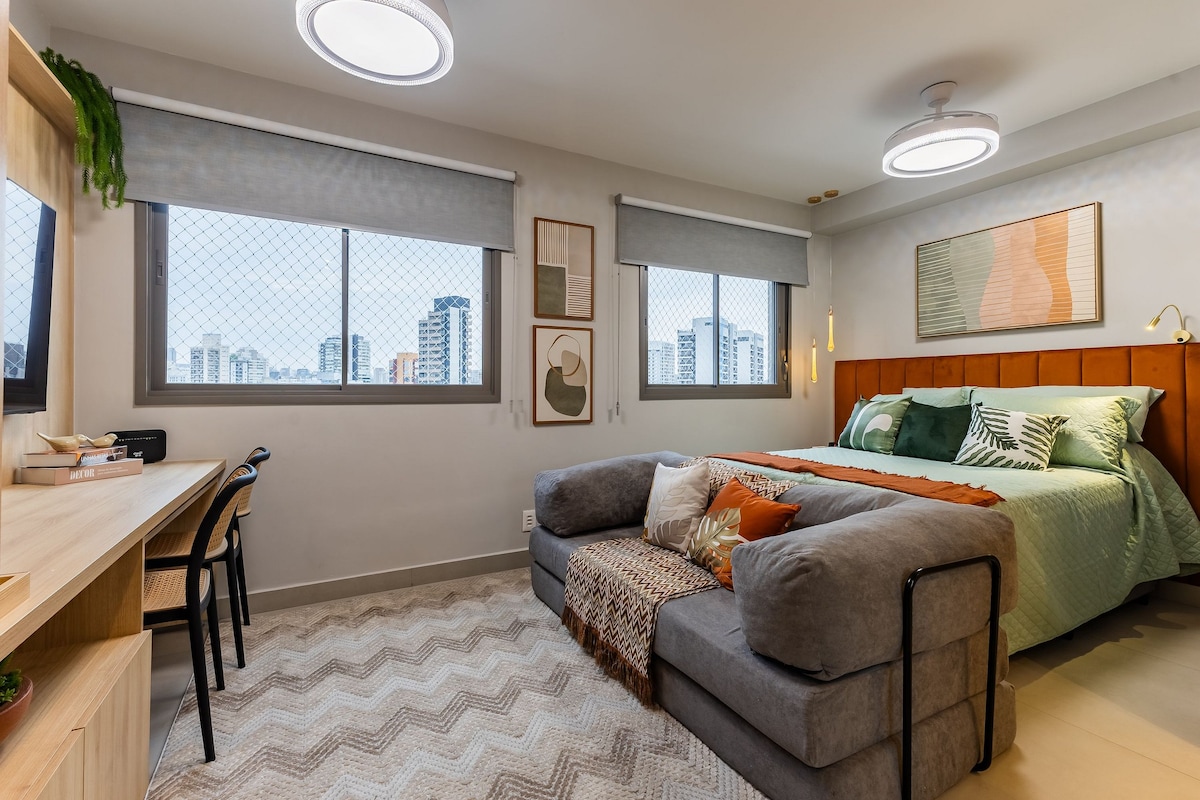 Complete and cozy studio where you will find everything for your comfort! The studio offers: • Queen-size bed and a spacious sofa • Air-conditioning and heater • Towels and bed linens • Kitchen utensils The building also features an infinity pool on the 20th floor, fitness center, sauna, garage and a mini market Here's what you need to work and/or relax with a wonderful view of SP