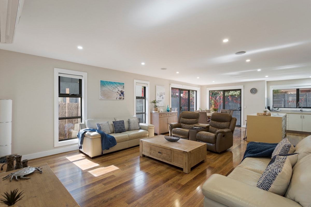 Leave your car 🏎in the driveway! 7 minute walk to the beach🏖 & Cafes & Restaurants 👨🍳🍷 Modern private air conditioned beach house offers 3 bedrms (sleeps7)2 bathrooms, big living area, and well appointed kitchen. Fireplace 🔥 Dishwasher 🍽 Coffee Machine ☕️ Backyard Al fresco dining 🥂 Wifi 👨💻 Aircon Come and enjoy the house, beach and cafes Max 7 guests min 2 nights during normal times & holiday periods vary. Linen and towels NOT provided Please note check in time for 31 Jan is 3pm