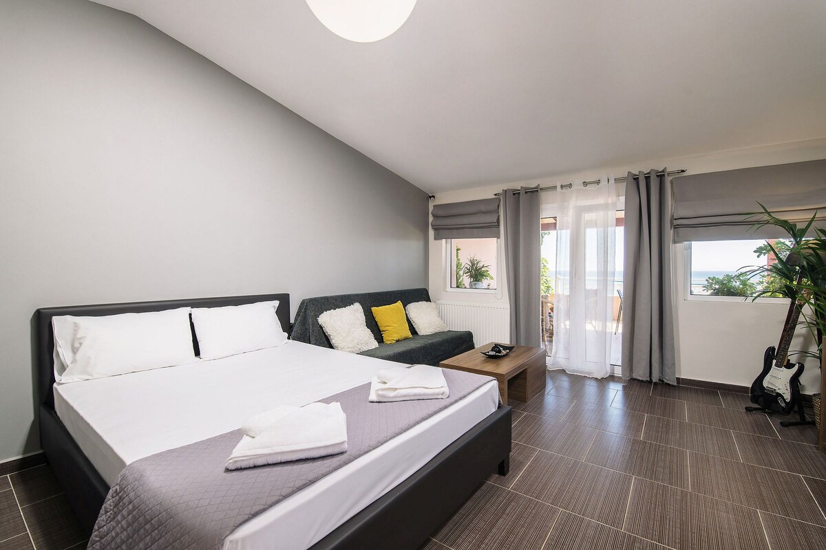 “Sky Blue Horizon” studio with an all new fully fitted modern kitchen comprising a full oven and hob, washing machine and large fridge. From the private balcony you have the magnificent “Ionion” sea views, from the outdoor garden area there are steps leading down to a small private beach. Akrotiri is a quiet location, close to Tsilivi. This beach front property offers access to a terrace, free private parking and free WiFi. The owner warmly welcomes you and wishes you a lovely vacation.