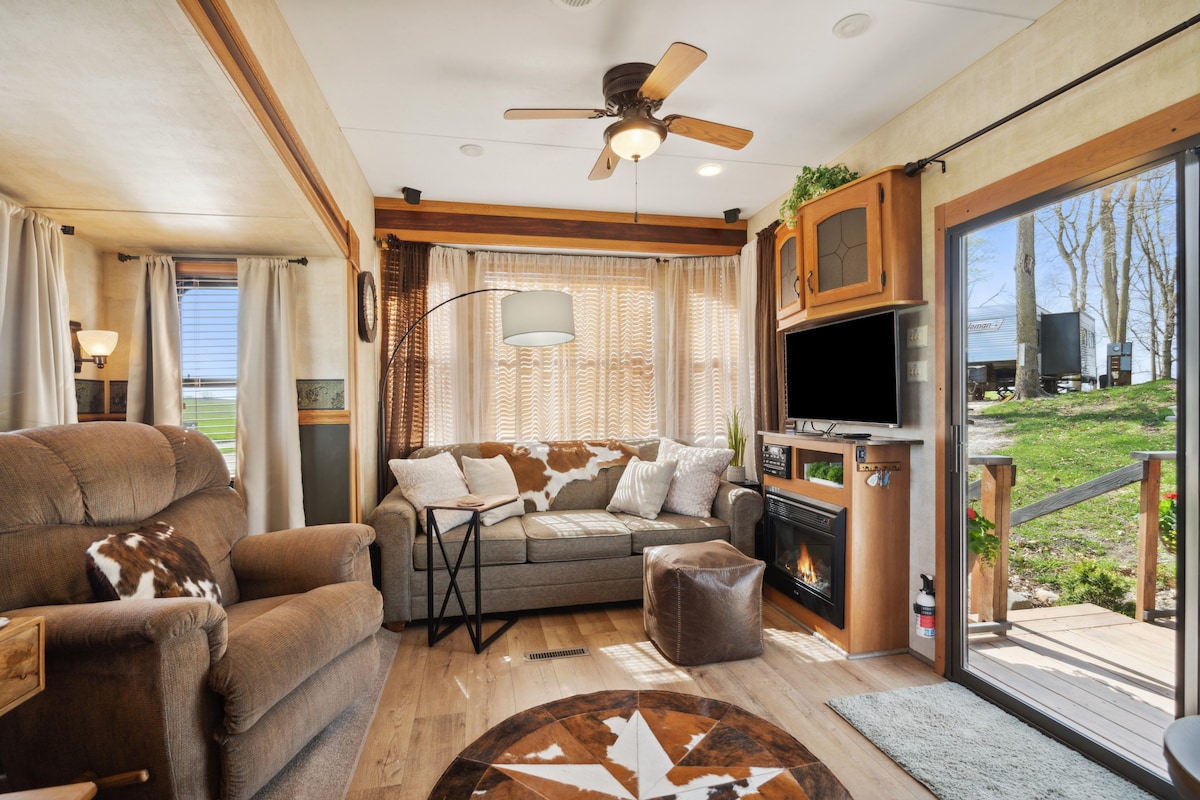 Welcome to The Hen House, a great place to relax and recharge! This forty-foot Montana camper is located near the Des Moines River. Your area has a great spot to grill and enjoy the outdoors. Our community swing fire gazebo is a great place to unwind. We are located in the famous rural Van Buren County that includes 11 villages - Specialty shops, dining, antiques, golfing & community pool. Lacey State Park has many outdoor adventures - Lake Sugema, hunting, fishing & hiking in the forest.