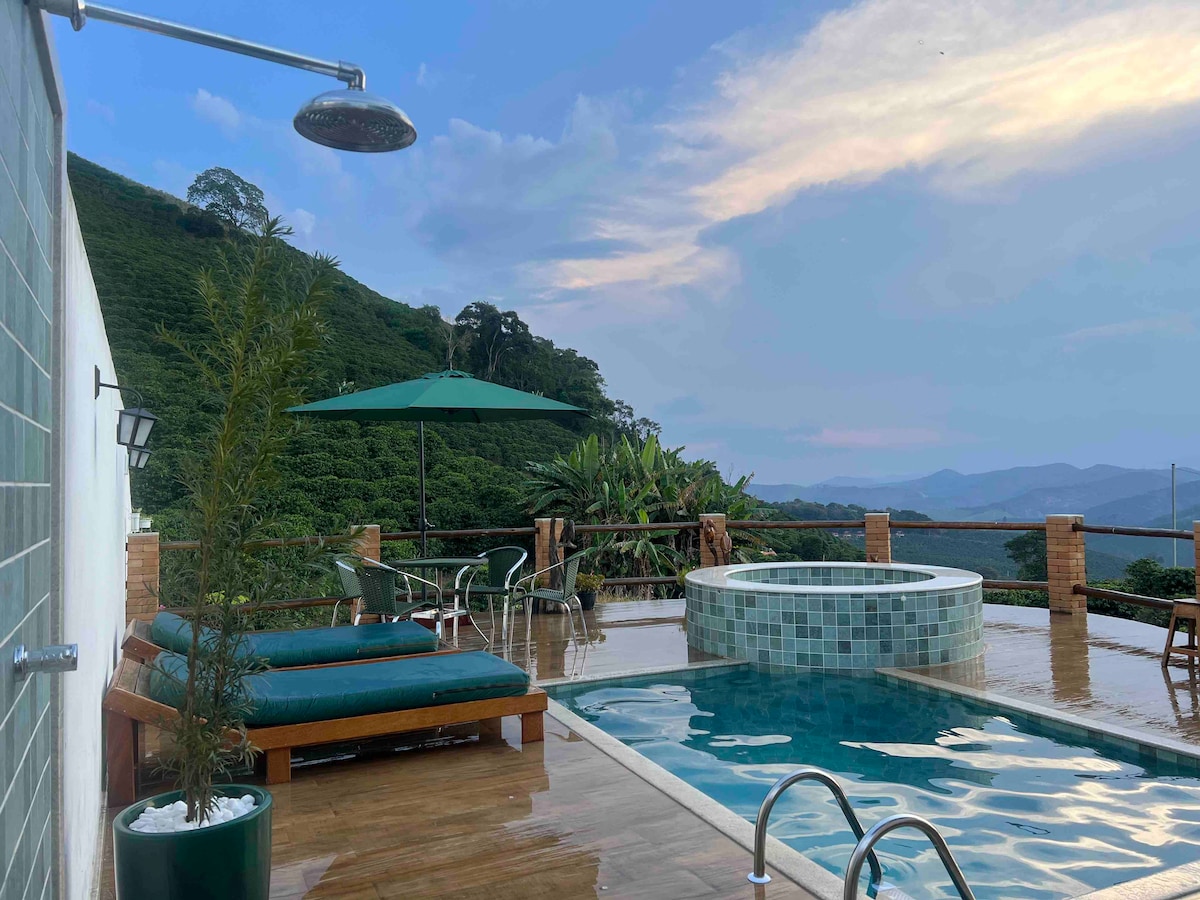 Charming exclusive Chalet, located at Ninho da Águia Farm, champion in specialty coffees. Our Farm is open to visitors, where we offer a tour that tells the story and process of coffee, from the tree to the cup. In 55 hectares divided into preserved forests, springs to intercropped plantations, in an agroecology management, the sustainable gardens that give rise to our grains are formed. We are next to the entrance of Caparaó National Park, on one of the slopes of Pico da Bandeira.