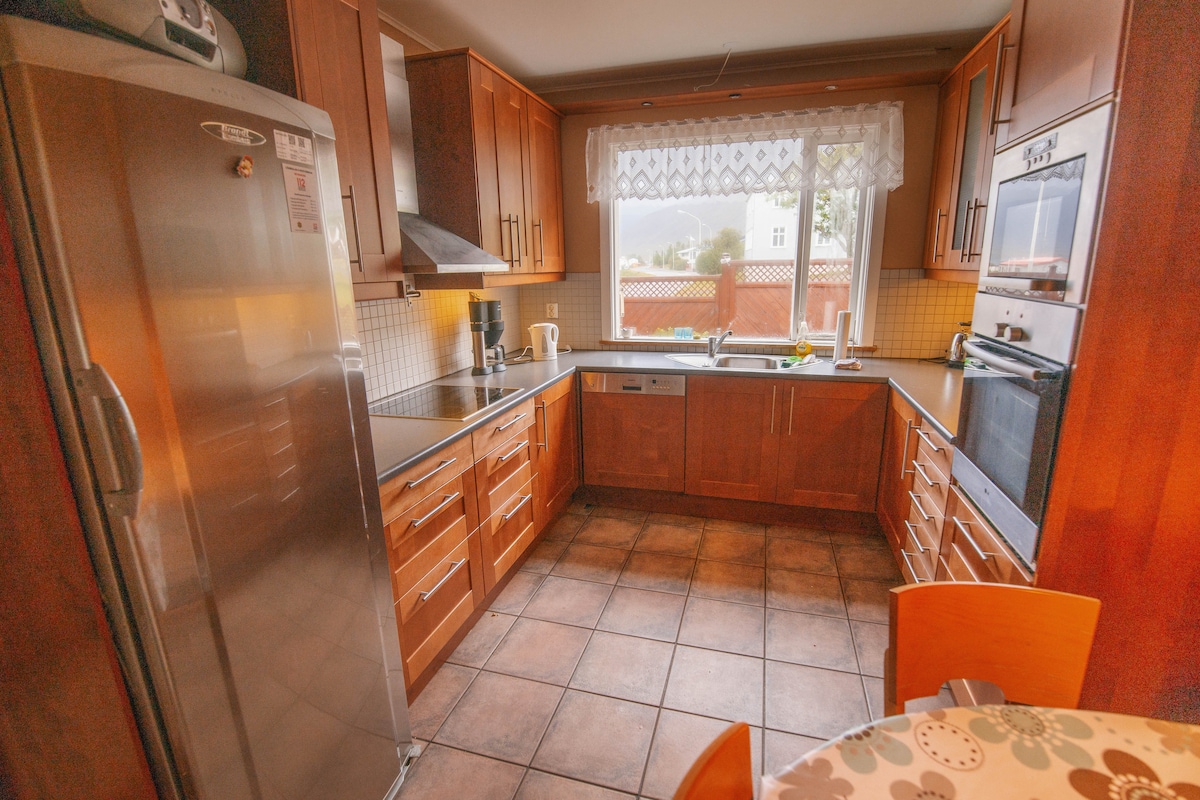A beautiful apartment with a panoramic view of probably the most beautiful fjord in Iceland. Stylish and nicely furnished - 60s style. 173 m2. Built in 1975 as a headmaster´s apartment for the elementary school that was resided on the ground floor. That space is presently not in use, which gives you more privacy. Luxurious apartment in a very remote place.