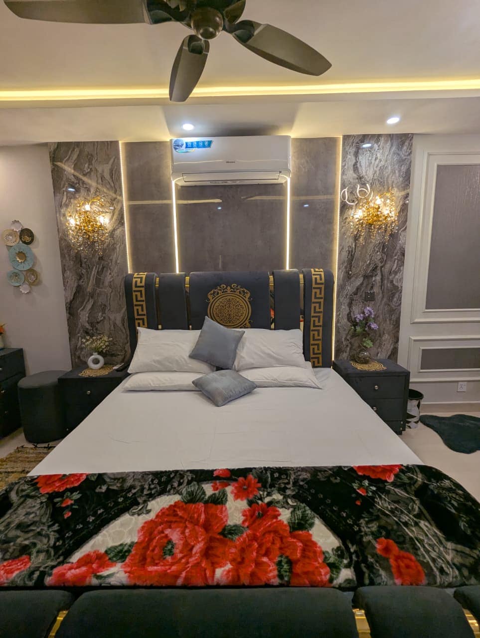 • Modern & Stylish: A contemporary bedroom with a focus on comfort and design. • Comfortable Bed: Features a bed with a light-colored, upholstered headboard and a crisp white bedspread. • Nightstand Details: Two matching nightstands, each with a lamp and decorative accents. • Elegant Backdrop: Set against a textured marble-effect wall, adding a touch of luxury. • Air Conditioned: Equipped with air conditioning for your comfort.