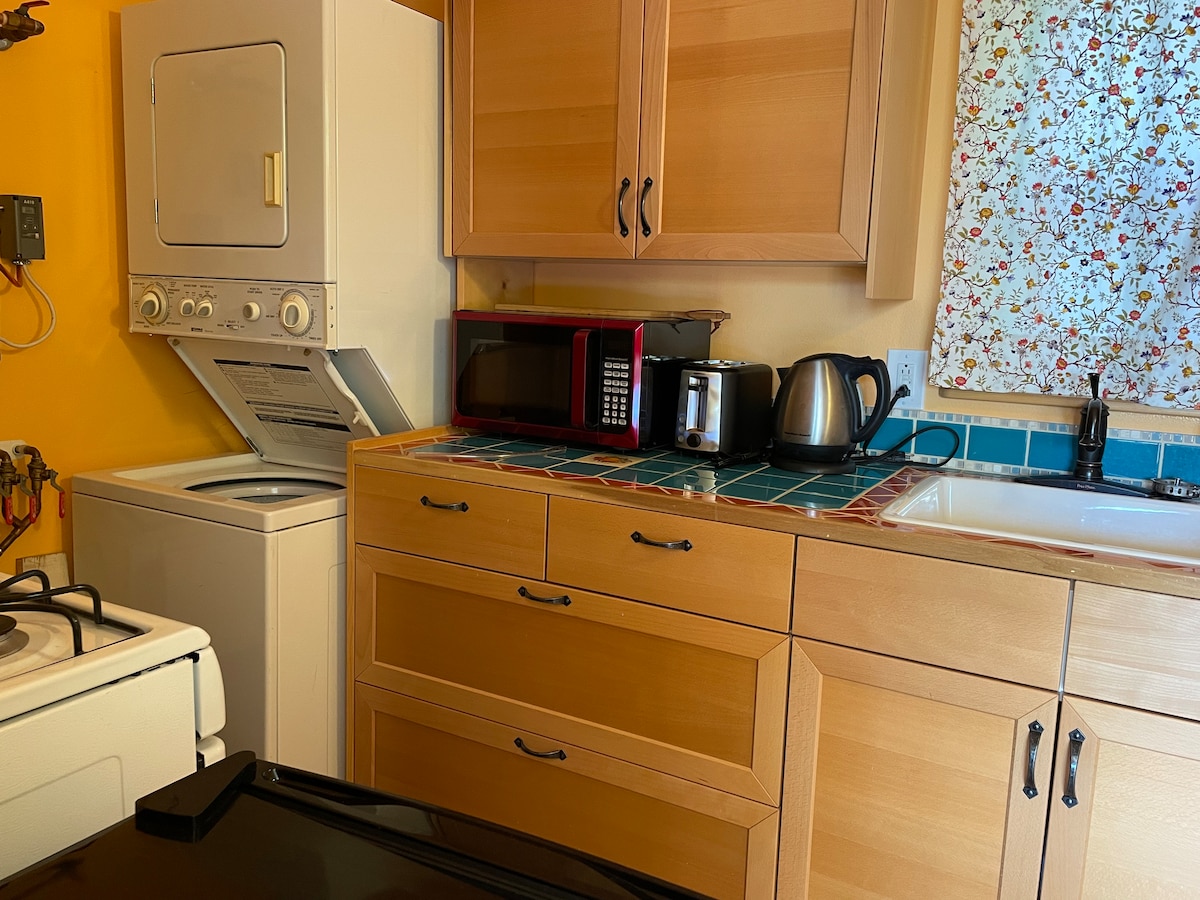 Our Little Cabin is a bright comfortable space with a 1/2 bath, including a sink and toilet. You will have access to a private full bath with roomy shower and laundry facilities accessible through our garage any time. There is a small refrigerator and microwave as well as Keurig coffee. There is a large window facing the garden with a view of the water through the trees. Longpoint Beach at the opening to Penn Cove is a 10 minute walk through our quiet neighborhood.