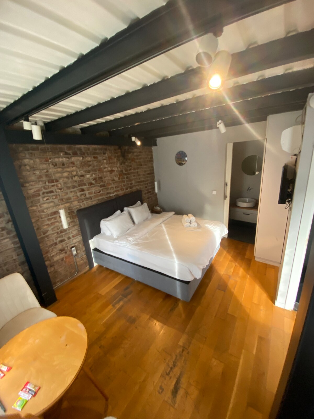 Our room is luxurious, modern and carefully designed. Located in our hotel, this room has a large double bed, a 43-inch smart television and a private bathroom. Our room has a small kitchen with a mini fridge and small kitchen supplies. Our room is on the 3rd floor. There is a 24/7 camera and security system. The exterior door of the building is specially coded and protected. Our room is designed to accommodate 2 people.