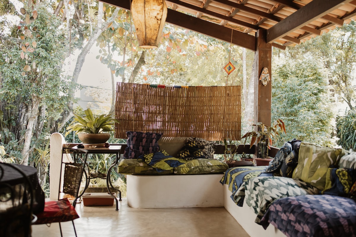 100 meters from the most beautiful and popular beaches of Arraial d'Ajuda, Araçaipe and Apaga Fogo. With beach access right in front. Amid 3000 m² of green area, located between the river and the sea, a cozy chalet in the private condominium, Salamandra, for those who like contact with nature and comfort. Private, safe, simple and quiet. Rustic style, pleasant decor and lighting. Close to the ferries to Porto Seguro and 3 km from the center of Arraial. You'll feel at home!