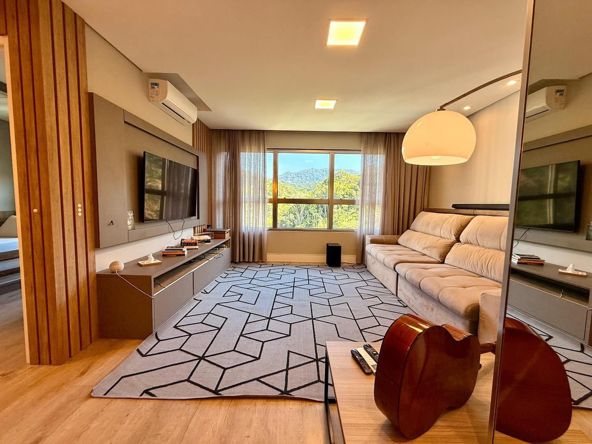 Kick back and relax in this calm, stylish space. Located 11 minutes from the beach! Close to Roda Gigante and Estrada da Rainha. Easy access to Praia Brava, Amores and Morro do Careca. Airy, bright, air-conditioned, excellent solar position, balcony facing the woods, one bedroom and in a gated community, with parking and 24-hour concierge! McDonald's and a supermarket are just in front! A gas station and convenience store with a 24-hour bakery next door! Havan store, Unimed Hospital, restaurants and shops nearby too! Fall in love