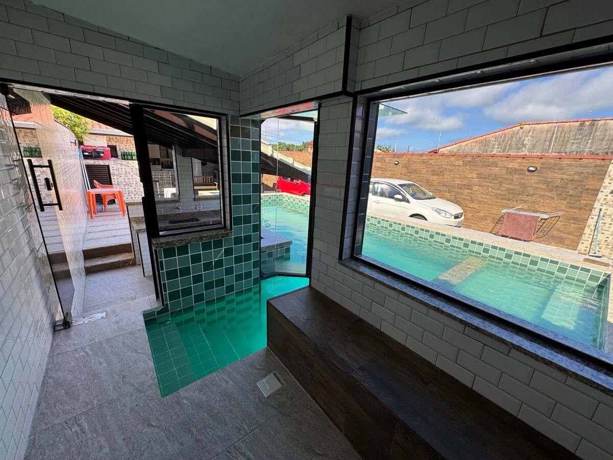 Casa localizada a 950 m da praia -Próximo a mercado e posto de gasolina 24 hrs -Piscina com bar molhado -Sauna -Hidromassagem -Cozinha com churrasqueira integrada na área de laser -TV -Wi-Fi -Som -Dois banheiros (sendo um na área de laser) -Três quartos e cinco camas -Cerca elétrica - Garagem interna p/4 carros (Caso o hóspede deseje levar colchão é possível acomodar mais pessoas) Ideal para acomodar família e amigos.