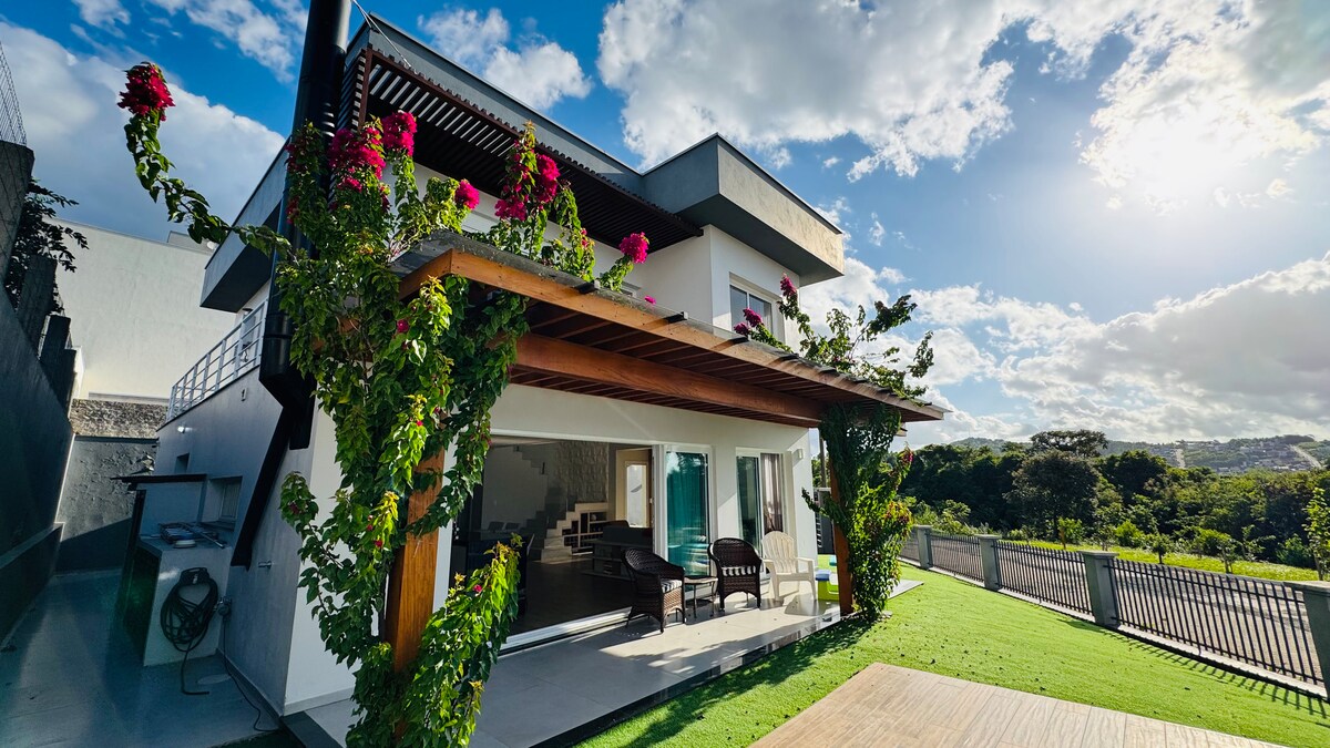 Discover the elegance of this 250m² home in Pé da Serra. With modern architecture, fireplace, barbecue area, and pool, every space blends comfort and style. The master suite and two bedrooms, all with walk-in closets, ensure privacy and sophistication. The fully equipped kitchen is perfect for refined cooking. In a peaceful neighborhood with easy access to markets, bakeries, and pharmacies—luxury meets convenience.