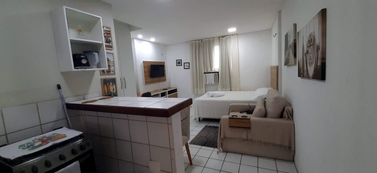 Oceanfront studio, 15 minutes from the Airport and old Recife and Convention Center. Old and traditional building in the most popular and safe spot of Boa Viagem Beach with Seu Tito restaurant, Alphaiate bar and Borsoi café on the ground floor, 24-hour convenience store and Assaí Supermarket nearby. Ideal for practical and dynamic people, with good internal structure, kitchen, wifi, queen bed, air conditioning and good shower. Third guest accommodated on a comfortable mattress for short stays.