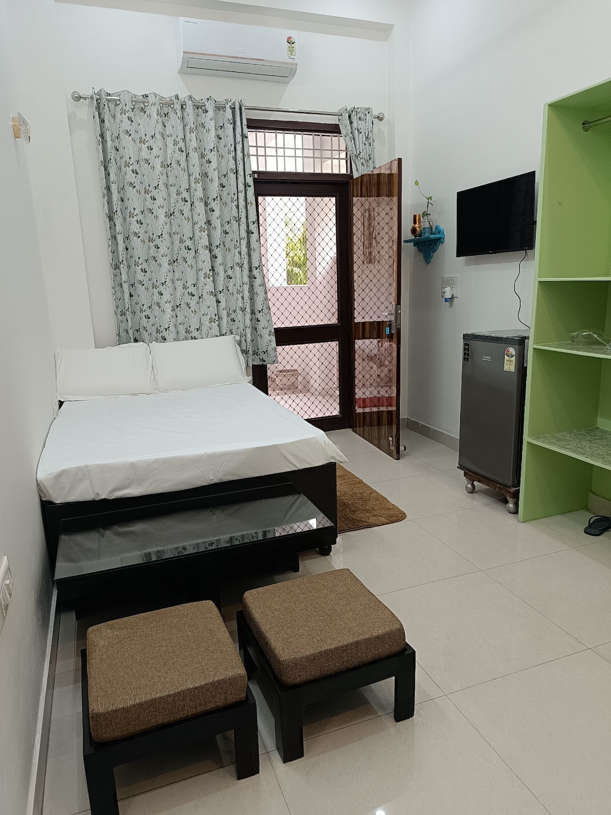 Two room's kitchen Studio Separate Portion (1st floor stairs access),which will have its independent entrance. Details AC Bed Room : Queen size bed (6” soft mattress ) with attached toilet Living Room : Heritage Bed 4X6 size with mattress For extra guest Futon ( safa cum bed) Amenitie High speed Fiber optical broadband WiFi Dedicated workspace including Heritage wooden writing desk with chair Kitchen with elect induction, water purifier, air fryer and essential kitchen utilities