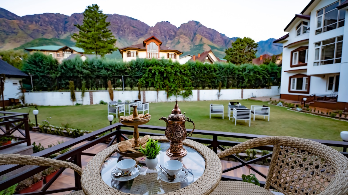A reminiscent of an old English mansion. It is a delightful blend of British colonial architecture with kashmiri interiors. It is located in Rajbagh an area within the city centre but simultaneously in quite neighborhood environs and strategic location with eateries and restaurants at walking distance. The premises has a well maintained orchard and lawn for a quality family time. There is adequate staff including cook to take care of meals and housekeeping. Free breakfast is included.