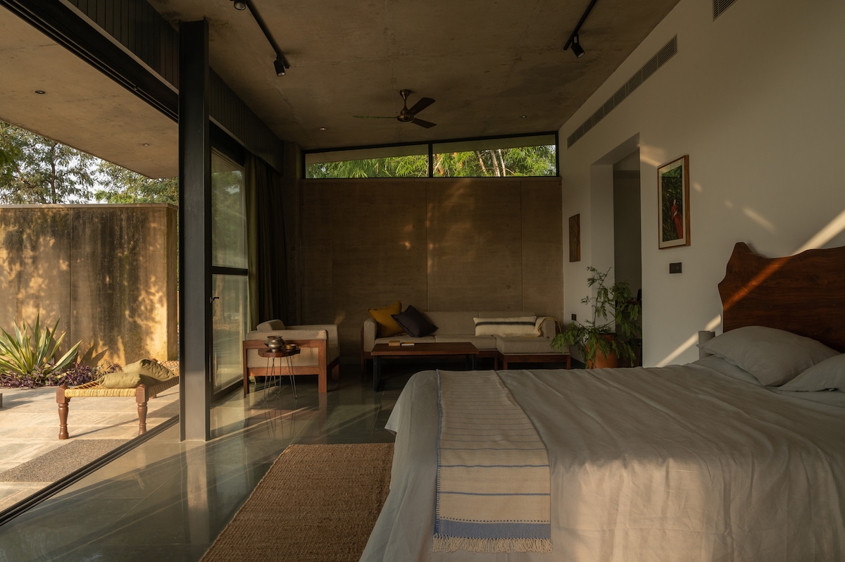 Spacious, earthy, and designed with your and natures comfort in mind. This suite comes with a private plunge pool, large windows, and views of the surrounding farm & forest. King bed En-suite bathroom Writing desk and lounging space Organic cotton linen and bath essentials Breakfast is included. All meals are prepared using seasonal produce grown on the farm or sourced from nearby. You can opt for Full Board, which includes lunch, evening snacks, and dinner (additional cost)