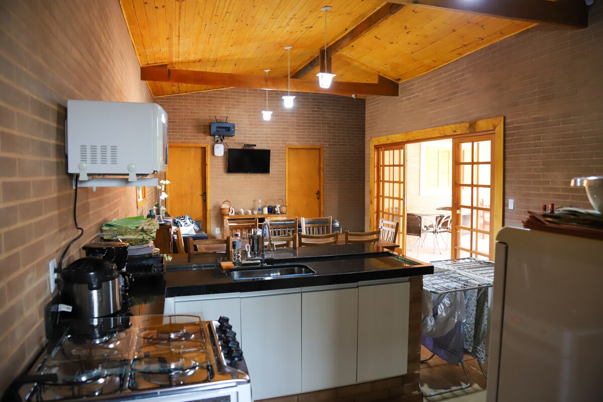 Single-storey house surrounded by nature. Here you can have contact with nature, horses, an orchard of jabuticabeiras and a lake for fishing. The place is ideal for families with children and for those looking to disconnect from the big city, only 1 hour from São Paulo. The house contains kitchen utensils, bed linen (we do not offer towels) and a barbecue on the balcony overlooking the pool and a kiosk. On sunny days, the view from the balcony is privileged with a wonderful sunset.