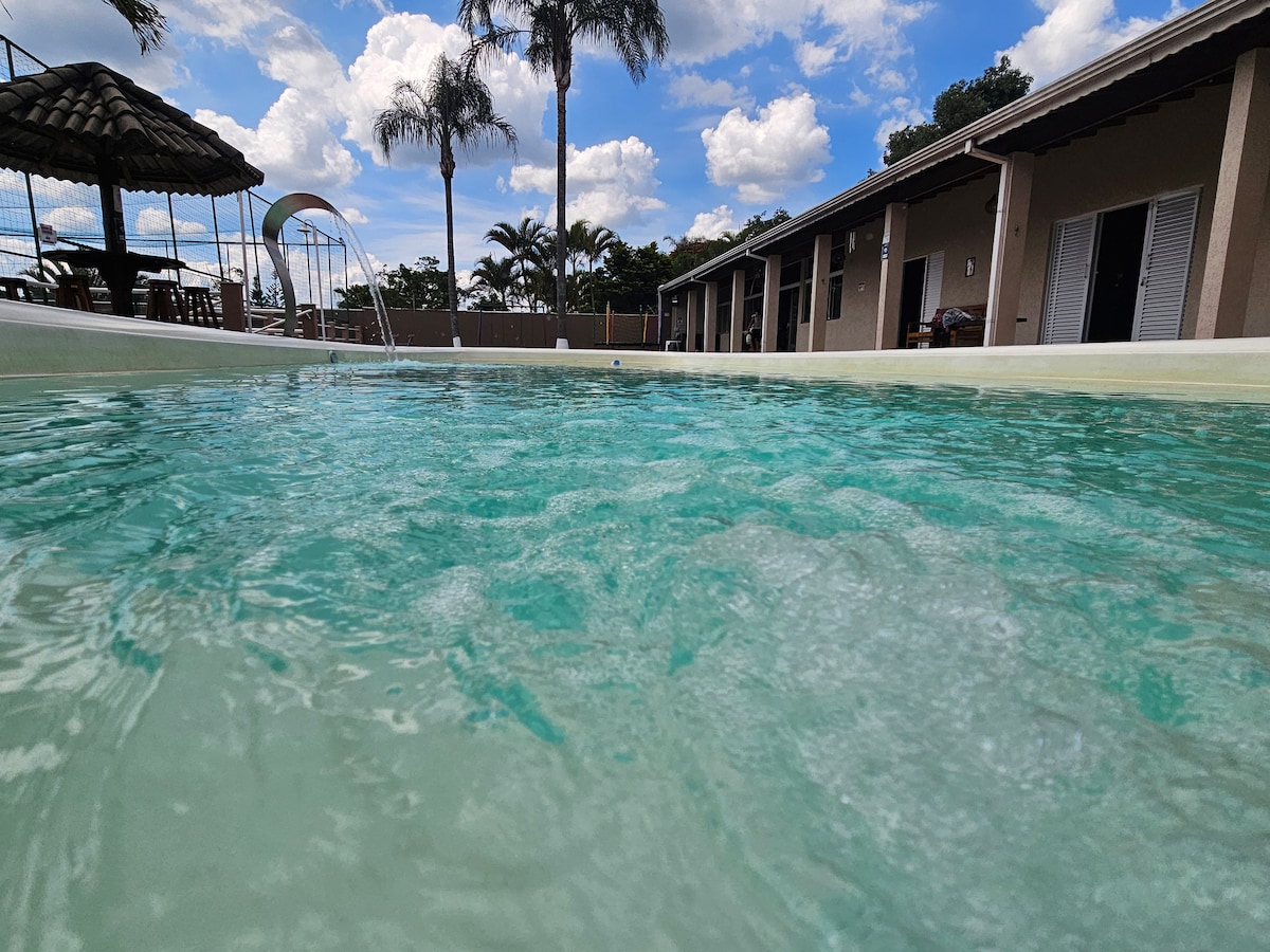 Be enchanted by our farm, ideal for families seeking leisure, comfort and rest. It has a heated pool (26–32 °C), barbecue and a large walled yard, with closed gates, ensuring safety for children and pets to play and have fun freely. The house has 1 en-suite, 1 double bedroom and 1 bedroom with single beds, all with air-conditioning, as well as a guest bathroom, integrated kitchen, laundry room and a large gourmet space next to the pool. Experience unforgettable moments!