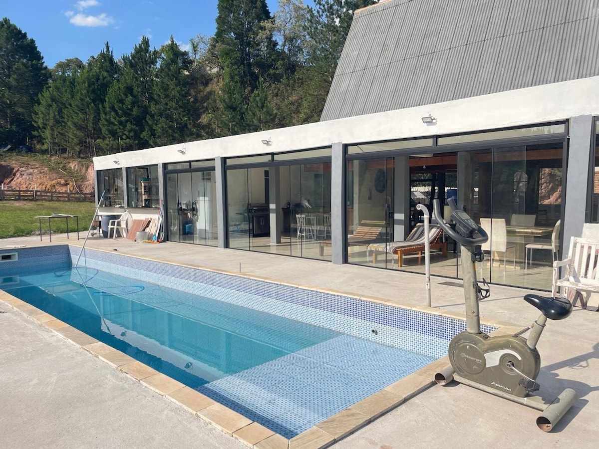 Enjoy our farm, perfect for families looking for leisure and rest. It has a heated pool (26-32 °C), barbecue and a large walled yard, with closed gates, ensuring safety for children and pets to play and have fun freely. The house has 1 suite, 1 double bedroom and 1 bedroom with single beds, all with air conditioning, as well as a social bathroom, integrated kitchen, laundry room and large gourmet space next to the pool. Experience unforgettable moments!