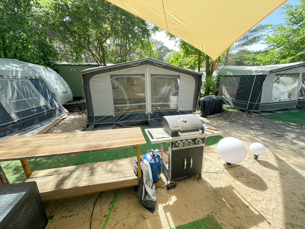 We provide our seasonal base for trips to the sea at the Ekolaguna campsite in Chałupy. It is a well-kept Dethleffs trailer with a vestibule on a wooden platform, in the second row from the bay, next to a super clearing and a pleasant little sandy beach with a place to launch/land kayaks. The whole is well and aesthetically equipped +WiFi. Clean, cute and in a great neighborhood ;-) Comfortable showers, washroom, and toilet are in the central area of the campsite. Guests are also required to pay camping fees